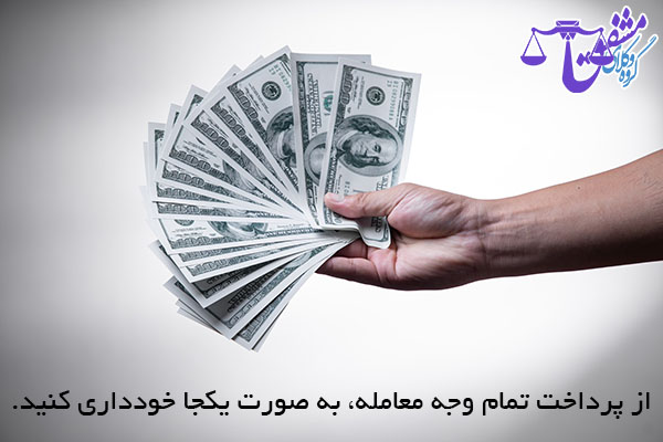 به هیچ عنوان مبلغ معامله را تا زمانی که ملک مورد نظر را تحویل نگرفته اید و سند به صورت قانونی به نام شما انتقال داده نشده است، به صورت کامل به فروشنده پرداخت نکنید. بهتر است در هنگام قرارداد حدود 20 درصد مبلغ ملک را پرداخت کنید و در آخر نیز 80 درصد مبلغ باقی مانده را پس از انتقال رسمی سند به نام شما بپردازید.